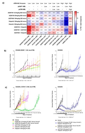 When used as monotherapy, all DDRi agents showed some degree of response across models with a trend for enrichment of activity for those models with truncating ATM mutation and VAF > 0.5 (Figure 3a). Overall, across all 11 PDXs regardless of the nature of the ATM alteration, AZD6738, AZD7648, and olaparib monotherapy treatments (at any dose level) all achieved a minimum best response of 50% tumour growth inhibition (TGI) in 4 out 11 models (36%) albeit the responses were not in the same models. Further stratification of models by truncating ATM mutations (n = 8; all tATM IHC H score low) showed that AZD6738 monotherapy achieved a minimum of 50% TGI best response in three (GA2254, OV2029, and PA3023) of five models with a VAF >0.5 (60%) (Figure 3a–c and Figure 4a for tumour growth curves) and in none of the three models with a VAF ≤ 0.5 (0%) (Figure 3a and Figure 4b for tumour growth curves). AZD7648 monotherapy achieved at least 50% TGI in 1 (GA2254) of the 5 models with a VAF > 0.5 (20%) and two (BN2276 and LU6473) of the three models (40%) with a VAF ≤ 0.5 for ATM truncating mutation. Olaparib monotherapy showed at least 50% TGI activity as the best response in OV2029, GA6275, and PA1221 models. These models had ATM truncating mutations with PA1221 and OV2029 having VAF of >0.5 (two out of five, 40%) whereas GA6275 had a VAF of ≤0.5 (one out of three, 33%). Interestingly, the LI6622 model showed a >50% TGI best response to all three DDRis as a monotherapy. LI6622 contained an ATM slice site mutation and high baseline tATM protein IHC H score and was unique in that it also displayed high baseline pATM, pKAP1, and γH2AX (Figure 2 and Figure 3a and Appendix A, Figure A4 for growth curves). None of the models with missense ATM alterations (all high tATM IHC H score) (Figure 3a and Figure 5b,c) achieved a minimum of 50% TGI as the best response to monotherapy with any of the DDRi agents. AZD6738 was the only DDRi agent acting as a monotherapy that achieved tumour regression (>100% TGI) in the GA2254 model (Figure 3a,c).