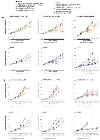 Eleven PDX models were used for this study. The treatment arms consisted of monotherapies with AZD6738 at 25 mg/kg and 12.5 mg/kg twice daily (BID), AZD7648 at 100 mg/kg once daily (QD), and olaparib at 100 mg/kg QD or BID. In combination doublets, AZD6738 was combined with olaparib or AZD7648 and AZD7648 was combined with olaparib. Details on the doses and schedules are shown in Table 1.