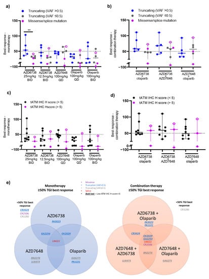 Correlation of the best responses of DDR agents and tATM assessment methods in 11 PDX models. (a,b) Median % TGI best response for monotherapy and combination therapy of DDR agents across models grouped according to ATM biallelic truncating mutation (VAF > 0.5) and ATM monoallelic (VAF ≤ 0.5)/missense/splice-site mutation, respectively; (c,d) Median % TGI best response for monotherapy and combination therapy of DDR agents across models grouped according to low (<5) or high (>5) tATM IHC H score, respectively, where each dot represents one model and LI6622 is represented as an open circle; (e) Venn diagram showing the best response across models with monotherapies and combination therapies with different DDRi agents. AZD6738 was used at 12.5 mg/kg BID (7ON 7OFF) in combination therapy with olaparib or AZD7648 at 100 mg/kg QD. The best response was calculated as the maximum % tumour growth inhibition (TGI) following a minimum of 14 days of tumour growth for each respective model. Horizontal dotted lines indicate a best response of 50% TGI. Non-parametric Mann–Whitney test pairwise statistical analyses for all groups are shown in Appendix A Table A3 and Table A4. ** Indicates a p-value < 0.01, otherwise results are non-significant.