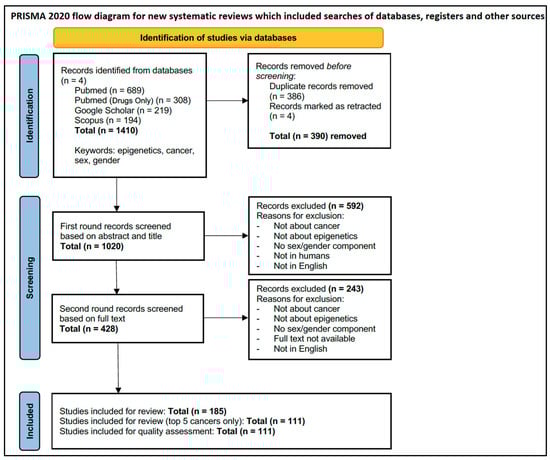 A scoping review was conducted to present the latest trends in sex/gender analysis in cancer epigenetics research (see the search summary and detailed methodology in Supplementary Materials S1 and S2). The protocol was reported following the PRISMA extension for scoping reviews (PRISMA-ScR) and made publicly available on Open Science Framework []. Peer-reviewed scientific literature was searched in PubMed, Google Scholar, and Scopus with keywords for cancer, epigenetics, sex, and gender. The eligibility criterion consisted of human studies published between January 2010 and August 2021 in English. Two independent reviewers performed the first- and second-round screening, data extraction, data analysis, and critical appraisal, with discrepancies mediated by consensus. From a total of 1411 initial hits, 390 duplicates were removed, 592 hits were excluded in the first round, and 243 studies were excluded in the second round. After classifying by cancer type, a total of 111 studies comprising the top 5 most populous cancer types (colorectal, gastric, head and neck, hepatocellular carcinoma, lung) returned from the search results of the epigenetics literature were ultimately included. Types of eligible studies included basic research studies, epidemiological studies, and reviews. Data extraction and a quality appraisal of all texts and figures was conducted by a team of epidemiologists and bioethicists to determine the state of SGBA according to SAGER and WHO guidelines. The results of the appraisal were used in conjunction with the results of the data extraction to provide a comprehensive report on the state of sex/gender findings in the cancer epigenetics field.