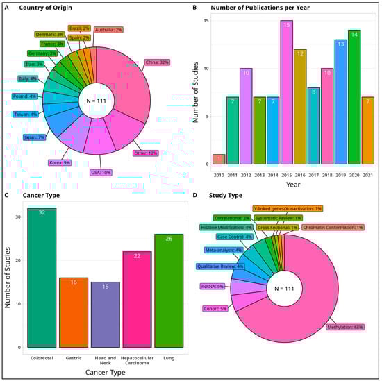 Characteristics of Sources of Evidence. Here, we describe the study characteristics of the total 111 eligible studies. (A) Country of Origin. (B) Number of Publications Per Year. (C) Cancer Type. (D) Study Type, where studies are broken down into basic research (methylation, histone modifications, chromatin conformation, non-coding RNA, drug studies, Y-linked genes), clinical research involving human participants (case control, cohort, correlational, cross sectional), and reviews (meta-analyses, systematic, non-systematic qualitative reviews).
