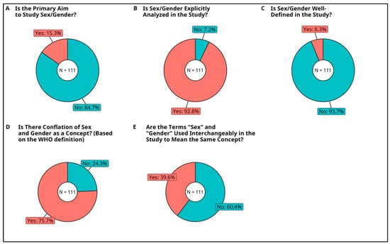State of Sex and Gender Analysis in Selected Studies. In accordance with SAGER guidelines for sex and gender reporting and analysis in health research, we assessed the state of SGBA in the full text and Supplementary Materials of all 111 eligible studies, using key probing questions. (A) Is the Primary Aim to Study Sex/Gender? Yes = The main goal of the study was to examine sex/gender differences in cancer epigenetics and was explicitly stated in the aims statement. No = The aim of the study was about some other aspect of cancer epigenetics, and/or sex/gender was included without explicit emphasis. (B) Is Sex/Gender Explicitly Analyzed in the Study? Yes = A significant portion of the study utilized some qualitative or quantitative method of sex/gender analysis, with the methods of SGBA being well described. No = The study may have reported sex/gender characteristics but did not describe how sex/gender was analyzed in relation to the study’s aims. (C) Is Sex/Gender Well-Defined in the Study? Yes = A definition for sex or gender was provided explicitly in the text. No = A definition was not provided. (D) Is There Conflation of Sex and Gender as a Concept? (Based on the WHO definition) Yes = The context, discourse or cognizant understanding of the term sex or gender did not follow the respective definition provided by the WHO. No = The use of the term “sex” or “gender” followed the definition provided by the WHO. (E) Are the Terms “Sex” and “Gender” Used Interchangeably in the Study to Mean the Same Concept? Yes = The terms “sex” and “gender” were used interchangeably throughout the study to refer to the same concept. No = The terms sex and gender were used separately and consistently.