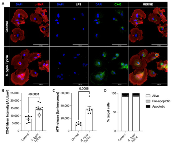 S. typhi Ty21a infection induces upregulation and opening of CX43 hemichannels on hemangiosarcoma primary cells, allowing the release of immunogenic peptides. Representative images of untreated and Salmonella-infected hemangiosarcoma cells (A) and quantification of CX43 expression in 4 independent experiments. Mann–Whitney, p < 0.0001 (B). Quantification of ATP released upon Salmonella infection. Mann–Whitney, p = 0.0006 (C). Annexin V-7AAD staining, showing hemangiosarcoma cell viability (D).