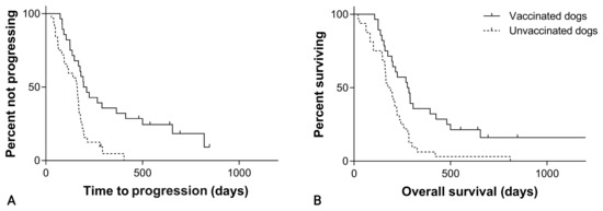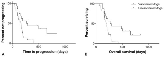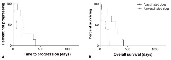 For vaccinated dogs, disease status was ascertained via imaging using standard techniques at each vaccination and on a monthly–bimonthly basis thereafter. For control dogs, disease status was ascertained via imaging after every two cycles of chemotherapy, at the end of treatment and after every 2–3 months thereafter until the documentation of progressive disease. When clinically indicated, additional diagnostics were performed.