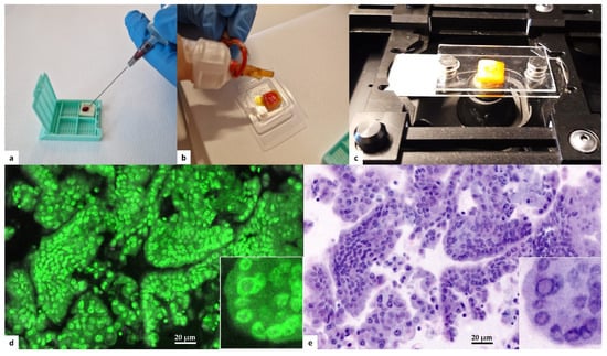 Fine needle aspiration (FNA) of thyroid nodules was performed using a 22-G needle under US guidance. Two passes were obtained for each nodule. The first pass was smeared on a conventional glass slide, fixed with alcohol based cytospray (Bio-fix, Bio-Optica, Milan, Italy), and submitted for cytological evaluation. Cellular material from the second pass was delivered on a commercial polymeric scaffold for cytological samples (Cytomatrix, UCS Diagnostics, Rome, Italy). Cytomatrix is a CE-IVD diagnostic tool intended to produce a cellblock directly from the needle, avoiding needle washing and the following laboratory preparations. Cytomatrix consists of a naturally derived, foam-like porous substrate endowed with a net positive surface charge that helps retain the cytological and microhistological material obtained by FNA/FNB sampling. After loading cells on the scaffold (Figure 1a), it was immediately prepared for Vivascope analysis. The scaffolds were dropped with acridine orange solution (0.6 mM; Sigma-Aldrich, St. Louis, MO, USA) (Figure 1b) for 20 s before being rinsed with physiological saline solution to wash off any excess of acridine solution. The samples were quickly drained on absorbent paper, and then placed between two dedicated glass slides (Figure 1c). Glass sandwiches were then positioned in the FCM stage for image acquisition and conversion in H&E pseudocolor (Figure 1d,e). FCM images were stored on a dedicated hard disk, according to a patient identification number and intervention date. After confocal analysis on fresh cellular specimens, samples were formalin-fixed and paraffin-embedded for permanent microscopic diagnosis along with paired routine FNA samples. Both FCM diagnosis and conventional cytological diagnosis were reported in agreement with Italian and Bethesda systems for reporting thyroid cytology [16,17]. Since Vivascope imaging with fluorescent dye does not allow the assessment of slight chromatin alteration, we decided to put in one single category (Follicular lesion) all indeterminate cytological samples. Two expert pathologists in the field of thyroid cytology observed in blind all digital images, conventional FNA cytological smears, and permanent Cytomatrix FFPE. Patients with clinical indication for thyroid surgery were definitely enrolled for this study. Removed thyroid glands were formalin-fixed and paraffin-embedded for routine histological examination. Diagnoses were reported in agreement with WHO Classification of Tumors of Endocrine Organs 2017 [18]. Seriate paraffin sections from both Cytomatrix and surgically removed glands were submitted for molecular analysis at the Pathology Unit of S. Andrea University Hospital of Rome, to investigate the complete preservation of biomolecular characteristics of the cells after the Vivascope procedure and to confirm the availability of these specimens for genomic testing.
