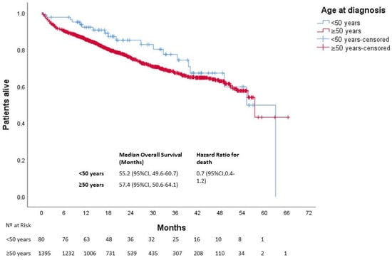 A total of 1475 patients were diagnosed with CRC, eighty (5.4%) of whom were <50 years old. Baseline characteristics are depicted in Table 1. Patients with EOCRC were more frequently diagnosed with metastatic disease (34% vs. 21%; p = 0.005), T4 cancer stage (44% vs. 31%; p = 0.05) and N positive disease (69% vs. 47%; p = 0.001). More patients in the EOCRC group compared to the older group had characteristics associated with worse prognosis, such as perineural invasion (34% vs. 22%; p = 0.029), signet ring cell (7% vs. 2%, respectively; p = 0.02) and high-grade tumors (19% vs. 8%, p = 0.004). The prevalence of dMMR/MSI-high tumors was higher among patients with EOCRC (14% vs. 9%), although the difference was not statistically significant. Mutational status was assessed in 422 patients, finding a higher percentage of wild-type (RAS/BRAF non-mutant) tumors in EOCRC than in the older cohort (62% vs. 34%; p = 0.02). Regarding treatment received, no differences were observed in the number of patients who underwent surgery (81% vs. 84%, respectively; p = 0.490). More patients with EOCRC received chemotherapy (85% vs. 62%; p < 0.001). In patients with localized disease (n = 1161), significantly more patients with EOCRC received adjuvant chemotherapy (71% vs. 39%, respectively; p < 0.001) and adjuvant oxaliplatin (81% vs. 50%, respectively; p < 0.001).