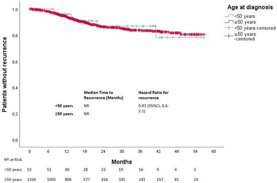 Time to recurrence in patients with localized disease according to age at diagnosis.