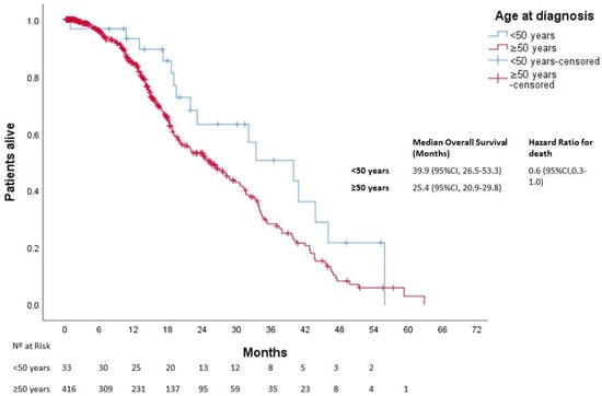 After a median follow-up of 25 months, 613 patients died. The median OS was not reached in either group (p = 0.270). Three-year OS was 80% and 67% in the younger and older groups, respectively (Figure 1). In patients with localized disease who underwent surgery (n = 1161), 133 events for time to recurrence (TTR) were observed. The median TTR was not reached in either group (p = 0.87). Three-year DFS was 86% and 73% in the younger and older groups, respectively (Figure 2). In patients with metastatic disease (de novo or metachronous; n = 449), significant differences were found between each group’s median OS, which was 31.4 months (95% CI: 18.9–43.9) in the EOCRC group and 18.2 (95% CI: 14.5–21.9; p = 0.049) in the older group (Figure 3). In the subgroup of patients with RAS/BRAF wild-type metastatic CRC, no differences in OS were found between the EOCRC and the older groups (p = 0.401). In patients with RAS/BRAF-mutated metastatic CRC, the median OS was significantly longer among patients with EOCRC than among patients aged over 50 years old (NR vs. 19.5 months (95% CI, 15.1–23.9), with the HR for death being 0.3 (95% CI, 0.1–0.8; p = 0.025) (Figure 4).