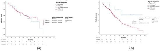 The prognosis and survival of patients with EOCRC compared to older patients is inconsistent [15,23,24,25,26]. No differences in outcomes in the whole population and patients with localized disease were found. Other authors also found that although patients with localized EOCRC received more aggressive surgeries and adjuvant treatments, these treatments did not have an impact in survival [21]. In the metastatic cohort, a significantly better OS in EOCRC was identified. These results might be explained based on differences found regarding biological features favoring a better prognosis for EOCRC, such as the absence of BRAF mutation and more frequent RAS/BRAF wild-type status, as well as the fact that younger patients tend to tolerate higher doses and more lines of chemotherapy. Interestingly, the prognosis of a patient according to their mutational profile is different between the younger and older cohorts. While we do not observe significant differences in overall survival in the RAF/BRAF wild-type population, patients with RAS/BRAF-mutated metastatic EOCRC perform significantly better than those in the RAS/BRAF-mutated older counterpart (Figure 4b). This result might be the consequence of biological characteristics not measured in the clinical practice in RAS/BRAF wild-type patients, such as APC mutations, which confer worse prognoses more frequently found in EOCRC [27]. Other alterations are known to be bad prognostic factors in the RAS/BRAF wild type, but to our knowledge, they have not been described as being more prevalent in EOCRC patients, such as PIK3CA mutations (a known negative predictor of response to EGFR inhibitors in RAS wild-type tumors [28]) and HER2 status (its expression in the membrane of the tumor cells is associated with a shorter progression-free survival (PFS) to EGFR inhibitors) [29]. Whether ultraselection of RAS/BRAF wild-type patients is the key to improving prognosis in this population is yet to be determined [30,31]. Surely, this underlines the importance of a performing a broader study of molecular alterations, such as next-generation sequencing in CRC patients and, more importantly, EOCRC patients, to better select systemic treatment in the metastatic setting.
