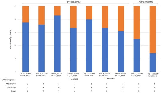 Percent of patients with EOCRC diagnosed with localized and metastatic disease according to the date of diagnosis. EOCRC, early-onset colorectal cancer.