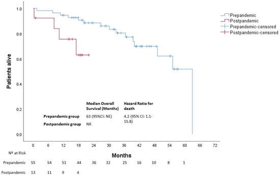 After a median follow-up of 34 months (39 and 17 months in the pre- and post-pandemic groups, respectively), 19 deaths were observed. Patients in the post-pandemic group had a significantly worse median OS than those in the pre-pandemic group (NR vs. 63 months (95% CI not estimated), respectively; p = 0.016) with an HR for death of 4.2 (95% CI: 1.1–15.8) At 12 months, 95% and 75% of patients were alive in the pre- and post-pandemic groups, respectively (Figure 6).