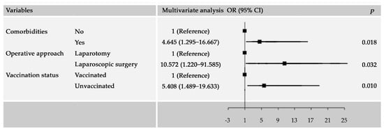 | Laparoscopic surgery | 6.408 (0.812–50.582) | 10.572 (1.220–91.585) |