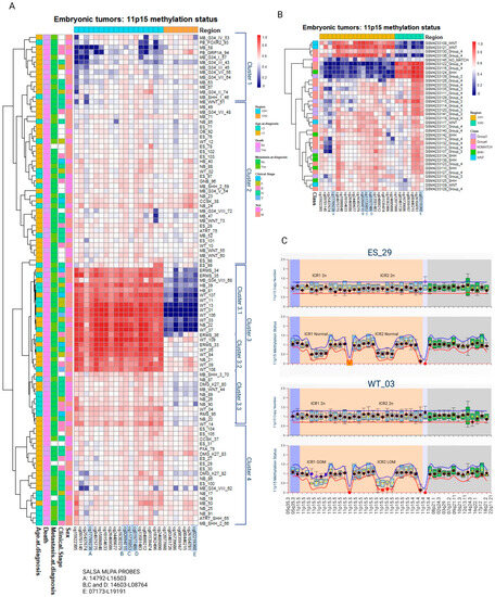 The methylation levels of the CpG sites located at ICR1 and ICR2 were used to conduct a hierarchical clustering analysis of the samples, using the Pearson correlation and complete linkage while maintaining the order of the CpG sites according to the chromosomal location. The clusterization was not associated with sex, clinical stage, metastasis at diagnosis, outcome (death), or age at diagnosis. The formation of these clusters was highly reproducible, with 95–100% bootstrap consistency (Figure 1A).