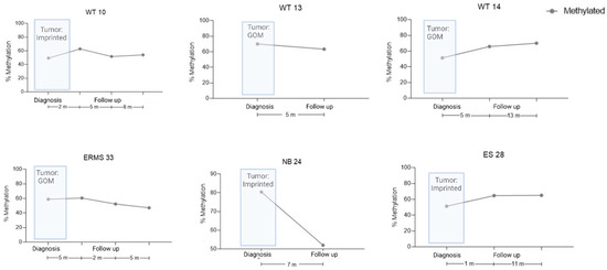 All 99 embryonal tumors were tested via an EPIC array. Of these tumors, 29 were also accessed via MS-MLPA and cfDNA (Figure 2). Of the 29 cases tested for cfDNA, 6 had blood collected at diagnosis and follow-up which were used to test ICR1 methylation status as biomarker for monitoring disease progression. Our findings demonstrate good agreement between the results obtained from the tumor samples analyzed via EPIC Beadchip arrays and MS-MLPA. Moreover, the dPCR method was shown to be robust as it correctly identified the presence or absence of ICR1 methylation in cfDNA samples in peripheral blood at the moment of diagnosis. Moreover, our findings suggest that the analysis of cfDNA via dPCR has the potential to overcome the limitations of MS-MLPA in detecting ICR1 methylation status, similar to what was identified via the EPIC Beadchip arrays. Tumor heterogeneity can pose challenges in accurately characterizing the methylation status of specific regions, and it appears that assessing cfDNA via dPCR may provide a more comprehensive and representative assessment of ICR1 methylation status. Herein, we analyzed tumor tissues but not peripheral blood cells, which prevented us from excluding children with alterations in mosaic or in the Beckwith–Wiedemann syndrome spectrum that did not have a clinical presentation, which is a limitation of this study. However, if present, these alterations would be identified in cfDNA methylation experiments.