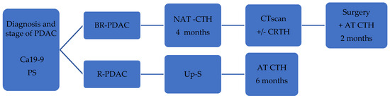 - Ghaneh, P.; Palmer, D.H.; Cicconi, S.; Halloran, C.; Psarelli, E.E.; Rawcliffe, C.L.; Sripadam, R.; Mukherjee, S.; Wadsley, J.; Al-Mukhtar, A.; et al. ESPAC-5F: Four-arm, prospective, multicenter, international randomized phase II trial of immediate surgery compared with neoadjuvant gemcitabine plus capecitabine (GEMCAP) or FOLFIRINOX or chemoradiotherapy (CRT) in patients with borderline resectable pancreatic cancer. J. Clin. Oncol. 2020, 38, 4505. [Google Scholar]