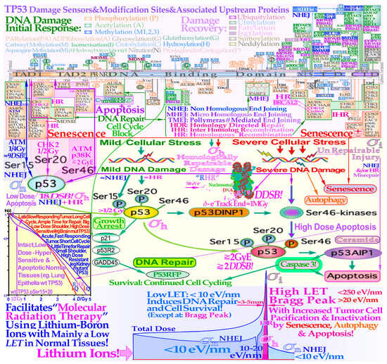 The complex response of the TP53 gene (upper third) to mild and severe genetic stress largely determines the cellular response to radiation [1,2,3,4,5,10,11,12]. Mild stress phosphorylates the serine 15 and 20 sites on p53 via ATM and CHK2, resulting in cell cycle block and DNA repair. This results in LDHS in normal tissues, but generally not in tumors, often with a mutant TP53 gene (as seen in the cell-survival insert (simplified middle third)). Local high doses or high ionization densities resulting in DDSBs (dual double-strand breaks [1,13,14]) increase the severity of the damage, also phosphorylating the serine 46 site, e.g., via p38K or ATM, and a high-dose apoptotic (HDA) response may be triggered. Lithium ions allow for unique therapeutic use by inducing a massive apoptotic–senescent tumor cell response, mainly within the Bragg peak (σh homologically repairable damage and σi direct inactivation cross-sections [1,2]). However, in front of and beyond the Bragg peak, the LET is low, and rapidly and easily repairable nonhomological damage is mainly induced (lower third, σn cross-section [1], [2] (Figure 8), [7,8]). The upper third shows the inner workings of p53 in its complex downstream pathways (cf. [15] (Figure 1)).