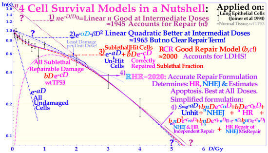 Interestingly, a recent publication on DNA repair [2] (Figures 7, 9a,b and 12a,c,d) demonstrated that this early low-dose cell loss before establishing full repair efficiency is mainly due to p53 LDA induction, in general agreement with [4,5] and the present study’s Figure 1 for a TP53 intact tumor. This direct LDA and LDHS is most likely a general property of intact normal tissues and the cell’s natural way to protect itself from low-dose, potentially cancerous, mutations before full repair efficiency is established [2,4,22]. Standard therapeutic 2 Gy fractions generate 75 DSBs and possibly one or two dual DSBs (DDSBs) that may be inducing high-dose apoptosis (HDA) via serine 46. As seen from the insert in Figure 1, many tumor cell lines, and more than 50% of all tumors generally, have a mutant TP53 gene that commonly eliminates most of LDHS and early LDA to obtain a radiation-resistant LQ-like shoulder. As shown for mouse embryo fibroblasts with key repair genes knocked out, both CHK2-/- and particularly ATM-/- cells lose all the LDHS of wild-type (wt) cells, highlighting the importance of the low-dose phosphorylation steps [2] (Figure 13) and [23]. Obviously, there are also some wt TP53 and wt ATM tumor cell lines that may show the LDHS property (cf Section 2.6 Figure below). The most recent RHR paper also investigated LDHS and LDA for light ions, demonstrating that it generally peaks at low-LET ions (≈20 eV/nm, see Figure 3), where, for reasons related to ion interaction physics, the highest low-energy δ-electron production per unit dose occurs, as the LET is low but sufficient to induce apoptosis, and the ion fluence per unit dose is highest. Thus, apoptosis peaked here (31% measured at 3 Gy of 40 eV/nm B5+ [2] (Figures 7, 9, 10 and 12)), and a clear but small LDHS was observed [24] mainly due to the early dual NHEJ only and HR misrepair (5% at 0.5 Gy, calculated [2] (Figures 7, 8 and 9b)). The 31% value was not just LDA but mainly serine-46-induced HDA. So, even if there is a weak low-LET ion LDHS and LDA, it is most likely not sufficient to establish a real light ion fractionation window with carbon ions but surely with the entrance plateau and fragmentation tail of low-LET lithium ions (in Figure 1 [2,7], in Figure 2 [2,20] (with 60Co) and Figure 4 (with mut p53-reactivated)), as well as for lowest-LET boron ions and 60Co in Section 2.6. The Bragg peak should always be reserved for target tissues. Thus, HDA is very valuable [25], and even more so, the often associated senescence [1,2,26,27,28], also described in Figure 1, since it does not cause later problems with caspase-3 [6]. To further elucidate the development of the shapes of the cell survival curve, some key steps are summarized in Figure 2, considering the normal lung epithelial cell data [1,2,20]. During the 1940s to 1960s, the logarithmic linear model (Ln) was established, with a back extrapolated (slope D0) initial cell number (n) larger than 1 to account for cellular division and repair during irradiation. Alternatively, the so-called quasi-threshold dose (Dq) was also used to indicate that the linear extrapolation seemed to start from a dose that was wasted due to tumor cell repopulation and repair. Clearly, this was a rather crude way to describe the early cell survival that often was of low clinical importance at the time but not really today [4]. From the late 1960s, the still currently dominating linear quadratic model could better describe the slight curvature of the quasi-linear high-dose cell survival by its α and β factors of most tumors but did not account so well for the low- and high-dose survival, at least for most normal tissues, as seen in Figure 2. It also misses a true repair term, as a high repair requires a high β, but that means less survival since the term is negative, so α needs to be reduced to better describe the survival, which may only work in a small-dose region and α loses its original meaning. This illogical effect, and the fact that it gives a poor description of LDHS normal tissue survival, has misled two generations of radiation biologists to trust it rather uncritically. The beauty of the third repairable–conditionally repairable (RCR) model is that it is very simple and describes what occurs at large to the cells using Poisson statistics with a simple exponential term for missed cells and a linear exponential term for the correctly repaired fraction of sublethal hit cells. Thus, it is a logical continuation of the Ln expression, as seen in Figure 2 and [29]. It therefore can describe the LDHS quite well and solves the repair and overkill problem at high doses seen with the LQ model. The repairable–homologically repairable formulation (RHR) goes a few steps further by accounting for the two major DNA repair pathways, as mentioned above, and their associated misrepair processes, as seen in the lower right corner of Figure 2. This model can therefore handle, e.g., cell lines with mutant and/or knocked-out repair genes, high and low LETs, and apoptosis induction [1,2]. It is thus extremely important to consider the significant differences between the cell survival of most tumors and generally LDHS normal tissues when designing optimal radiation therapy protocols. It is unfortunate that the bulk of established tumor cell lines mostly suffer from TP53 and associated mutations, so they can easily grow in the lab and lead to the assumption that all cell lines have LQ-like shoulders, almost making the LQ model a dogmatic model of true cell survival. In fact, it is most likely that all intact normal tissues have wild-type TP53 and ATM genes, and thus are linked to LDHS and LDA, as recently indicated [1,2,4], and it is probably an inherited growth advantage to avoid cancerous transformations after low-level genetic damage that may not be correctly repaired. The intriguing reason why it went undetected for such a long time is that too few studies were conducted on live normal tis