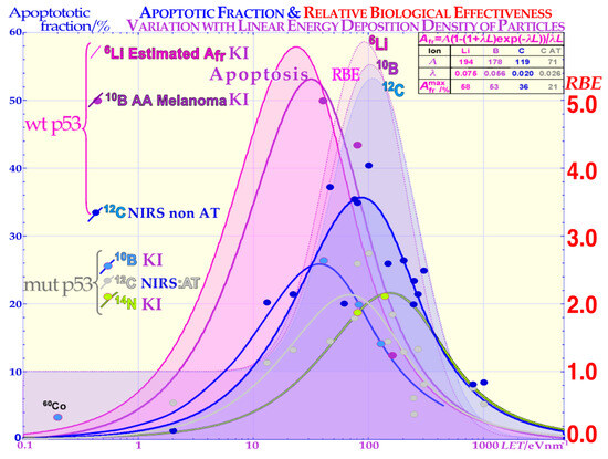 Comparison of the induced apoptosis (programmed cell death shown with solid lines and experimental dots) and the clonogenic survival measured by the RBE (pale-shaded dashed areas) as a function of increasing LET values. The induction of apoptotic cell kill depending on the status of the p53 pathway of the cells is also shown. When some part of the p53 pathway is mutant, AFr is reduced to about half its value for normal wt p53 and non-AT cell lines that are intact on the ATM gene upstream of p53. Interestingly, the AFr peaks occur at lower LET values than the RBE peaks due to the higher flux density of ions and apoptotic events per unit-absorbed dose. KI is Karolinska Institutet Stockholm Sweden, and NRIS is National Institute of Radiological Sciences, Chiba, Japan, and the table is used for extrapolation to lithium ions and discussed in the text.