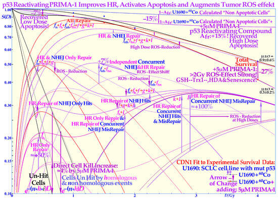 The cell survival effect of the mutant p53-reactivating compound PRIMA-1 on the TP53 mutant SCLC cell line U1690 after exposure to 60Co γ-rays is shown in detail in Figure 4, indicating full survival. The curves with PRIMA-1 are here shown as solid lines, and the plain SCLC cell line U1690 without PRIMA-1 are shown as dashed lines, with arrows indicating the change in survival by the presence of PRIMA-1 during irradiation. At higher doses, the relative survival loss is quite large (almost 27% at 4 Gy, see Figure 4). Therefore, there would be a clinical advantage of using high doses per fraction with PRIMA-1. There is an increased HR repair alone (fh by almost 50%) but also to fix NHEJ misrepair (l is more than doubled), indicating that the HR pathway is largely improved through p53 reactivation, partly increasing the very low-dose apoptosis [2]. The recovery of the HR pathway with PRIMA-1 is more than tenfold increased below 0.15 Gy, sixfold at about ½ Gy (LDA), fourfold at 1 Gy, and more than doubled at high doses (HDA) with PRIMA-1. Due to the wide therapeutic effect spectrum of the active component MQ of APR 246 and PRIMA-1 [2,32], both on reactive oxygen species (ROS), inhibiting the enzyme thioredoxin reductase 1 and thioredoxin and decreasing cellular glutathione levels and increasing apoptosis, it is difficult to say exactly what caused the increase in HDA apoptosis by ≈15% in the current study. Even if PRIMA-1 increased the HR only, and its repair of NHEJ misrepair, this probably occurred due to improved HR initiation via TP53, there are also indications that apoptosis could be caused by direct mitochondrial effects or via caspase-3, and the cell cycle block via p21 is not generally restored either [33,34]. This latter fact may even be an advantage for cancer treatment as tumor cells will continue cycling and incorporate damaged DNA in their genomes without repair, and they may finally end up in a mitotic catastrophe situation like in classical radiation therapy. The first very interesting cell culture study of using APR 246 on colorectal cancer combined with radiation was recently published, and mut TP53 showed almost wt TP53 response with 5 μM APR 246, whereas TP53 Null cells were only half as responsive [35] generally consistent with Figure 4. At 7.5 μM, the mut cell line was even more responsive than the wt, which should be a valuable treatment property. In a tumor growth assay, 20 μM APR 246 and 6 Gy both halved the mut xenograft size, whereas the combination brought it down to ≈1/5, but wt showed only a 30% APR 246 reduction, and null and mut cells were similar [35]. Interesting Venn diagrams of significantly enriched pathways and genes for combined and radiation-alone treatments were also included for wt, mut, and TP53 null cells.