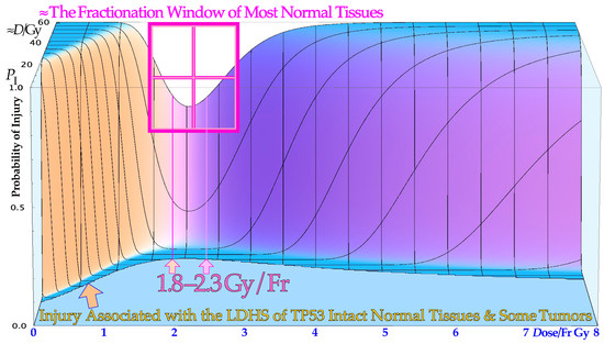 The TP53 gene and its key associated DNA repair pathways, NHEJ and HR, are linked to the LDHS and low-dose apoptosis of most normal tissues, whereas most experimental tumor cell lines are rather radiation-resistant at low doses, often due to a mutant p53, as shown in the lower left insert of Figure 1 and Figure 4. This has important consequences for radiation therapy (and radiation protection for that matter), as it causes the well-known clinical fractionation window with minimal damage and apoptosis in normal tissues at ≈2 Gy/Fr of low ionization density radiations. The common tumor radiation resistance at low doses due to TP53 mutations can be treated most effectively with light ions. However, to avoid normal tissue damage, the lightest ions from helium to boron are most effective since their ionization density is mainly elevated in their Bragg peaks to be solely placed in the gross tumor, allowing for the effective use of the clinically well-established low-LET and LDA fractionation window at 2 Gy/Fr in normal tissues. The lower left insert of Figure 1 and (the Graphical Abstract) also implies that the low-LET tumor dose should be well above the 2Gy level.
