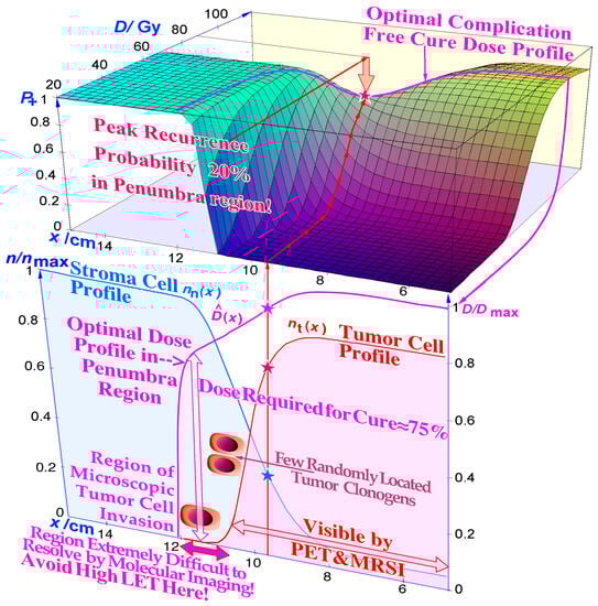 The optimal shape of the dose profile in the penumbra and setup margin region at the periphery of the internal target volume, assuming a microscopic invasive tumor of Gaussian spread (pink-shaded). Toward the end of the treatment, there are very few clonogenic tumor cells in this volume, and the probability that any of them is hypoxic is very small, even throughout the treatment, so there is no real need to use a high LET in this region (see also the periphery shown in Figure 10). It still needs a fairly high dose via low LET as the response is logarithmic (≈75–80% of Dmax) and much less if it initially received a high dose of ion therapy. P+ is the probability of a complication-free cure (Figure 8).