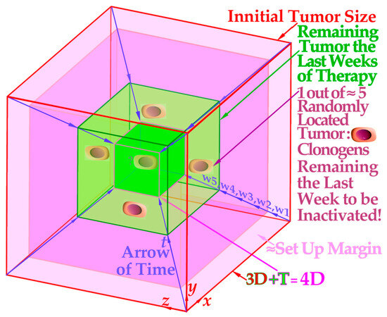 Interestingly, the last week and a half or so of treatment can thus be considered a low-LET treatment of the periphery of the four-dimensional space–time internal target volume [26], as shown in Figure 10, for simplicity and clarity drawn assuming an initial cubic tumor volume. The target volume is shown shrinking in the fourth time dimension for simplicity and clarity and to obtain a real 4D perspective. The true tumor volume may shrink a little during the treatment but not necessarily, e.g., if we really manage to induce massive senescence [7] (Figure 5) and [26,27,28]. The initial setup margin (pale pink) and the few remaining gross tumor clonogenic cells at the beginning of the last week of therapy (green volume in Figure 10) are all at the periphery of the 4D space–time internal target volume [36]. This volume will benefit from the lowest possible LET to secure the highest complication-free cure and steepest possible tumor response, avoiding tumor microdosimetric cold spots as well as peripheral organs at risk of hot-spot damage with high-LET beams (Figure 8 and [1] (Figures 20 and 22)).