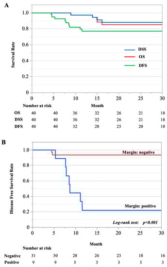 Kaplan–Meier curve. (A) Two-year overall, disease-specific, and disease-free survival rates for all cases reviewed. DFS, disease free survival; DSS, disease specific survival; OS, overall survival. (B) The survival of two groups compared: cases with negative- and positive-margin resections.
