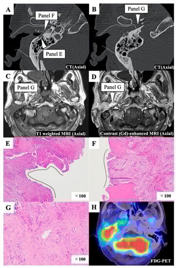 Representative case 20. (A,B) Preoperative enhanced computed tomography (CT) image. The white dotted line indicates the resection line. The white triangles indicate the areas affected by the tumor, as observed in the postoperative pathological examination. The white dotted line indicates the resection line. (C,D) Preoperative T1 weighted (C) and contrast-enhanced (D) magnetic resonance imaging (MRI) images. The white triangle shows that the tumor extends medially toward the parapharyngeal space and indicates the areas affected by the tumor, as observed in the postoperative pathological examination. (E) The posterior margin was affected by the tumor, as observed in the postoperative pathological examination. Black dotted line indicates the surface of the specimen affected with the tumor. (F) The medial margin was affected by the tumor, as observed in the postoperative pathological examination. Black dotted line indicates the surface of the specimen affected with the tumor. (G) Tissue from the parapharyngeal space was sampled for pathological examination after temporal bone resection, and this sample was found to be infiltrated with tumor cells. (H) An F-18 fluorodeoxyglucose–positron emission tomography (FDG-PET)/CT scan shows local recurrence six months after the initial treatment.