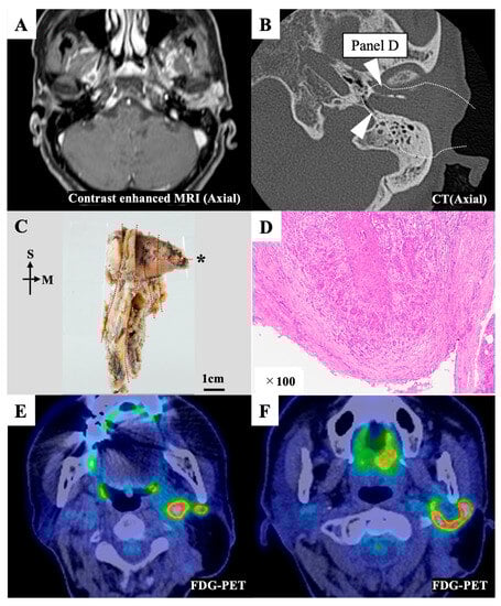 Representative case 11. (A) Preoperative contrast-enhanced magnetic resonance imaging (MRI) image. The tumor filled the external auditory canal. (B) Preoperative computed tomography (CT) image. The white dotted line indicates the resection line. The white triangles indicate the areas affected by the tumor, as observed in the postoperative pathological examination. (C) The en bloc resected specimen was divided into sections (red dotted line) for the pathological examination. The pathological image on the section with an asterisk (*) is shown in Figure 3D. (D) The anteromedial margin of section D was affected by the tumor. (E,F) An F-18 fluorodeoxyglucose–positron emission tomography (FDG-PET) CT scan showing multiple lymph node recurrence in the infratemporal and retromandibular spaces seven months after the initial treatment. M, medial; S, superior.