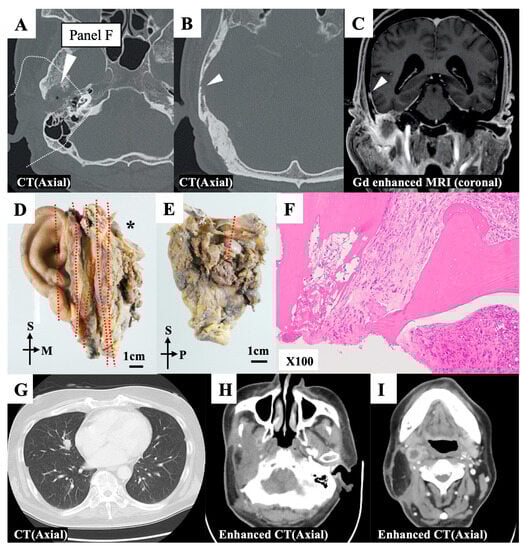 Preoperatively, the tumor had extended into the middle cranial base, accompanied by the destruction of the bony canal of the EAC; however, the jugular fossa and carotid canal were intact (Figure 4A–C). Preoperative contrast-enhanced magnetic resonance imaging (MRI) revealed that the middle cranial base dura was enhanced, reaching into the nodule of the squamous part of the temporal bone (Figure 4C). The tumor was located in the middle cranial base and extended into the glenoid fossa and parotid gland. We performed mSTBR combined with resectioning the squamous part of the temporal bone. The pathological examination (Figure 4D,E) revealed that the anterosuperior margin of the resected specimen, which corresponded to the anteromedial drilling line of the middle cranial base, harbored tumor cells (Figure 4F). However, anteriorly sufficient bony drilling of the middle cranial base had been performed, and a residual tumor was unlikely at the surgical site. Further, we observed no continuity between the nodule in the squamous part of the temporal bone and the middle cranial base. This suggested that the nodule was a distant bone metastasis. The postoperative pathological examination revealed the presence of vascular and lymphatic duct invasions, and we did also observe a distant bone metastasis. These findings provided the rationale for adjuvant chemoradiotherapy. However, this patient exhibited postoperative lymphatic node metastasis and distant metastasis of the lung (Figure 4G–I).