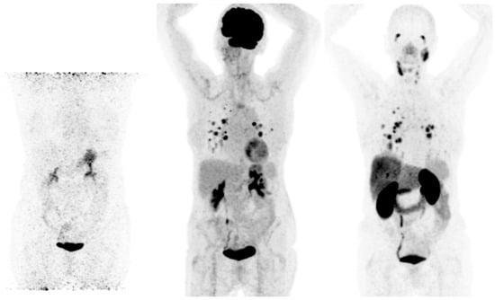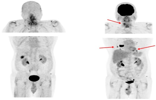 - Feine, U.; Lietzenmayer, R.; Hanke, J.P.; Wohrle, H.; Muller-Schauenburg, W. 18FDG Whole-Body PET in Differentiated Thyroid Carcinoma. Flipflop in Uptake Patterns of 18FDG and 131I. Nuklearmedizin 1995, 34, 127–134. [Google Scholar] [CrossRef]
