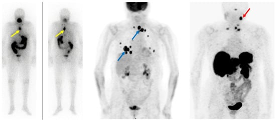 - Middendorp, M.; Selkinski, I.; Happel, C.; Kranert, W.T.; Grünwald, F. Comparison of Positron Emission Tomography with [(18)F]FDG and [(68)Ga]DOTATOC in Recurrent Differentiated Thyroid Cancer: Preliminary Data. Q. J. Nucl. Med. Mol. Imaging 2010, 54, 76–83. [Google Scholar]