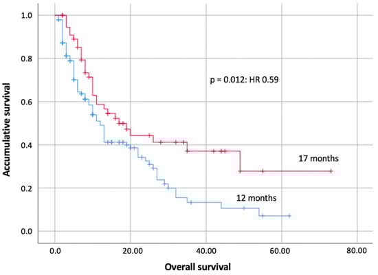 There was a statistically significant association between OS and those patients with some form of immunotoxicity. OS was observed for 17 months in those patients with immunotoxicity versus 12 months in those without (p = 0.012; HR 0.59 [95 CI 0.39–0.91]) (Figure 2). This association was not observed for PFS, which was 10 months for patients with immunotoxicity versus 7 months for patients without immunotoxicity (p = 0.151). A statistically significant association was also observed between response and toxicity (p = 0.004). Of the total of nine complete responses in the sample, a total of seven had some form of immunotoxicity.