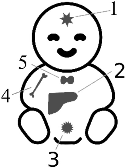 Sources of elevated AFP in infancy and childhood. 1—Intracranial germ cell tumors (IC-GCTs); 2—hepatoblastoma (HB), hepatocellular carcinoma (HCC), ataxia teleangiectasia (AT), primrose syndrome, tyrosynemia type I, neonatal intrahepatic cholestasis caused by citrin deficiency (NICCD), progressive familiar intrahepatic cholestasis (PFIC2), transaldolase deficiency (TALDO), hepatitis B (HBV); 3—malignant saccrococygeal GCT; 4—Fanconi anemia; 5—congenital hypothyroidism, van Wyk–Grumbach syndrome.