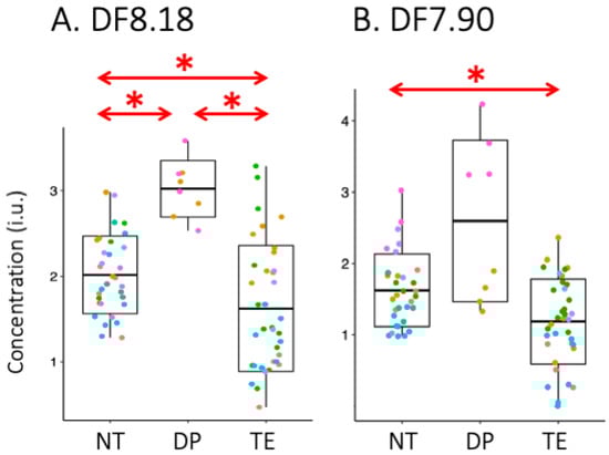Figure 4. Comparison of (A) DF8.18 and (B) DF7.90 ppm peak areas from LCModel (‘concentrations in institutional units’, i.u.) between regions classified as normal tissue (NT), disease progression (DP) and treatment effect (TE). Red arrows indicate statistically significant differences between groups (*, p < 0.05). It can be seen that DF8.18 levels are higher in DP than both NT and TE; in addition, DF8.18 levels are lower in TE than DP. DF7.90 levels are lower in TE than NT, but other group comparisons were not significant. Box plots show mean, +/− standard deviation and min/max from the whiskers. Color represents individual subjects.