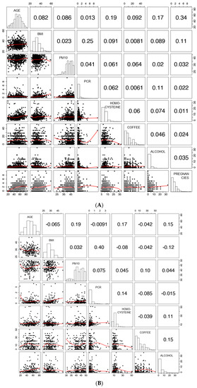 Concerning females, no major monotonic associations were observed; although, moderate (r > 0.1) correlations involved age with homocysteine, age and number of pregnancies, BMI and CRP, BMI and number of pregnancies, and CRP and alcohol consumption (Figure 1A). Similarly, in males, moderate positive correlations involved age with the PM10 annual average and alcohol consumption, BMI and CRP, BMI and alcohol consumption, CRP and homocysteine, alcohol and homocysteine, coffee consumption, and alcohol consumption(Figure 1B).