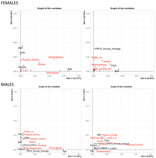 Concerning the FAMD, the plot showing the joint contributions of each variable is reported in Figure 2. In females, the first principal component, Dim1, is primarily related to age, menopausal status, and working status variables. Dim2 is predominantly related to BMI and PCR, with physical activity variables also contributing to a lesser extent. Lastly, the third principal component, Dim3, mainly comprises the PM10 annual average.