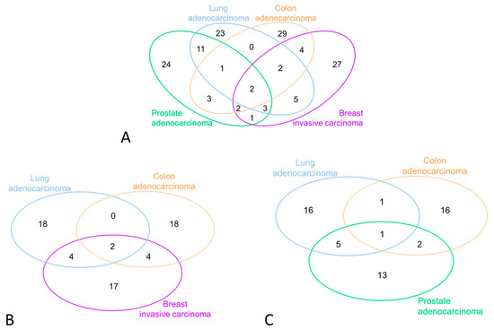 In Figure 3A, the overlapping miRNAs across various cancer types are displayed. In Panel B, we present the miRNAs observed in female cancers, expressed in at least 20% of the women included in this study. Similarly, Panel C reports the equivalent selection of miRNAs for male cancers.