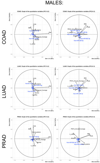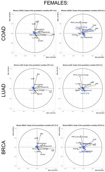 Additionally, Figure 4 and Figure 5 report (in females and males, respectively) the relationships of the miRNA subsets for each cancer type as supplementary (or passive) variables and continuous predictors (active variables). Only major associations are reported because the small observed correlations between the sets of active and passive variables lead to most of the miRNA projections that tend to gather very close to the centroid of the axes.