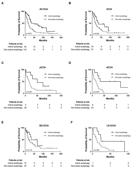 Kaplan–Meier curves for overall survival in CCA patients showing active and non-active autophagy. (A–F) Overall survival investigated for active autophagy in all types of CCA (A), iCCA (B), pCCA (C), dCCA (D), small duct type iCCA (E) and large duct type iCCA (F). Date of last follow-up was treated as censored observation. Abbreviations: cholangiocarcinoma (CCA), intrahepatic cholangiocarcinoma (iCCA), distal cholangiocarcinoma (dCCA), large duct type iCCA (LD-iCCA), perihilar cholangiocarcinoma (pCCA), small duct type iCCA (SD-iCCA).