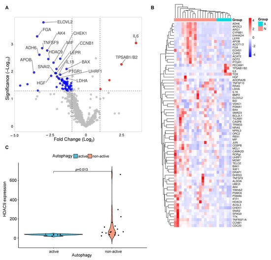 Prominently deregulated transcripts of active vs. non-active autophagy in iCCA. (A) Volcano plot showing each gene’s -log10 (p-Value) and log2 fold change with the selected covariate []. Highly statistically significant genes are positioned above the horizontal lines, while highly differentially expressed genes are distributed on either side. The plot includes labels for the 20 most statistically significant genes. (B) Unsupervised hierarchical clustering of differentially expressed genes among iCCA groups of active vs. non-active states of autophagy using Manhattan distance method and average linkage clustering across samples and transcripts. Active autophagy (n = 6), non-active autophagy (n = 17). Blue color indicates low expression, red color indicates high expression. (C) HDAC9-mRNA expression among groups of active and non-active autophagy. Violin plot with additional scatter plot (jittered values) presenting HDAC9-mRNA expression among groups tested for significance by the Wilcoxon rank-sum test (p = 0.013). Abbreviations: active autophagy (Group A), non-active autophagy (Group N).