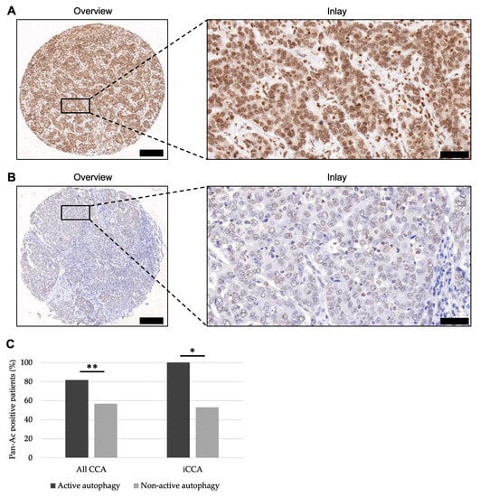 Representative images of pan-acetylated-lysine antibody staining in CCA tissue and expression differences between the groups of active and non-active autophagy. (A,B) Representative immunohistochemistry of high (A) and low (B) expression of pan-acetylated-lysine in TMA cores of CCA patients. Original magnification ×8.5 for overview and ×40 for inlay, respectively. Scale bars: 200 µm for overview and 50 µm for inlay, respectively. (C) Differences in pan-Ac expression between CCA patients showing active and non-active autophagy for all CCA subtypes and iCCA, respectively. Significance determinations were calculated using Spearman correlation as a measure of a variable’s association. p-Values were interpreted as follows: * p < 0.05; ** p ≤ 0.01. Abbreviations: cholangiocarcinoma (CCA), intrahepatic cholangiocarcinoma (iCCA), pan-acetylated-lysine (pan-Ac), tissue microarray (TMA).