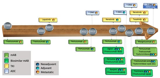 The advent of trastuzumab has been a remarkable breakthrough in the history of BC, due to its ability to prolong survival and improve quality of life (Figure 1). Trastuzumab has dramatically changed the trajectory of HER2+ populations, not only in BC but in other malignancies such as those involving the gastro-esophageal junction, colorectal, and endometrial carcinomas [29,30,31,32].
