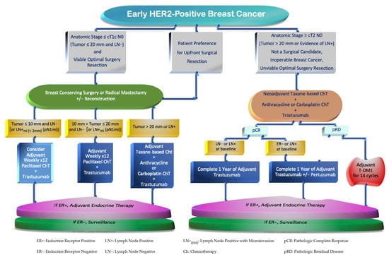 For physician decision making, it is important to identify which patients will benefit from systemic treatment upfront versus after surgery. These decisions are typically determined by the BC risk of recurrence. The evaluation of factors such as breast cancer staging based on radiological and clinical–pathological features characterizing the breast tumor size, nodal involvement, and HER2 levels of expression is required [52]. For example, BC with uninvolved LN and tumors measuring up to 20 mm, which correspond to anatomic stages (by The American Joint Committee on Cancer—AJCC [53]) I to IIA, are preferred for upfront surgery, followed by adjuvant systemic treatment [54]. Conversely, high-risk patients with larger tumors (≥T2 stage or >20 mm) and/or with axillary LN+ involvement, encompassing BC stages IIB and III, are mostly suitable for a multimodal disciplinary approach which consists of the following: neoadjuvant systemic therapy, followed by radical or conservative breast surgical resections, usually along with LN assessment with sentinel LN biopsy or axillary LN dissection [54,55]. These approaches should be followed by adjuvant systemic treatment and, if appropriate, the subsequent administration of endocrine and local radiation therapies [52]. The selection between HER2 blockers to be given after surgery would depend on microscopic pathology appraisal, where patients with pRD on the surgical specimen should be considered for adjuvant treatment modalities [9] (Figure 2).