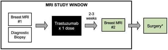 Study schema. Patients with newly diagnosed and untreated HER2+ breast cancer were eligible for the study. Patients enrolled in the study underwent two breast MRI exams, before and after receiving a single dose of trastuzumab. Tissue was obtained pre-treatment from the diagnostic biopsy and post-treatment tissue was typically obtained at time of surgery. * For patients planning to undergo a full course of neoadjuvant treatment, a research biopsy was carried out prior to initiating chemotherapy.