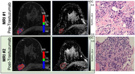 In HER2+ breast cancer, trastuzumab, a humanized mouse monoclonal antibody against the human HER2 receptor, is an essential component of treating the HER2-positive breast cancer subtype [3] and is known to stimulate an anti-tumor immune response [4,5,6,7]. Patients with increasing levels of tumor-infiltrating lymphocytes (TILs) in response to trastuzumab have better survival [4,8]. Both MRI and PET have shown promise as potential predictors of pre-surgical treatment response in the context of HER2+ breast cancer [9,10]. In this report, we focus on breast MRI, which is part of the standard pre-treatment evaluation at many cancer centers. There is evidence that breast MRI parameters such as functional tumor volume (FTV) and apparent diffusion coefficient (ADC) can be used as early predictive markers of chemotherapy response in local breast cancer [9,11,12]. Recent work also has shown that these breast MRI parameters may reflect the TIL composition of the tumor [13,14,15].
