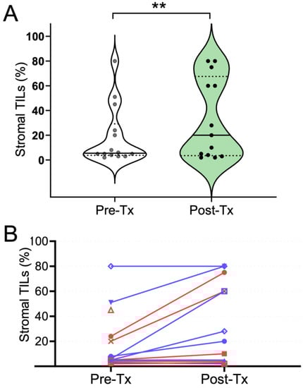 Tumor-infiltrating lymphocyte (TIL) distributions before and after trastuzumab treatment. (A). Treatment with trastuzumab generally induced an increase in TILs in the post-treatment specimen compared to the pre-treatment specimen (paired t-test, p < 0.01). (B). Pre-treatment and post-treatment TIL level pairs for individual patients (each patient represented by a unique symbol). Red indicates ER-positive patients, blue indicates ER-negative patients. One ER+ patient had only pre-treatment tissue available **.