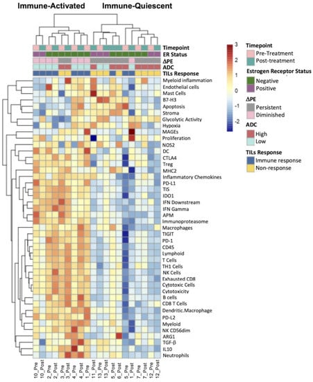 To further evaluate the alignment of MRI features with the immune tumor microenvironment, we derived immune signatures from the pre- and post-treatment samples using RNA sequencing. For purposes of this exploratory analysis, patients were split into “persistent” and “diminished” DPE and “high” and “low” pre-treatment ADC based on the median values of DPE and ADC of the cohort. After quality control metrics, nine paired patient samples (pre- and post-treatment) and two non-paired samples were available for analysis (Figure 4). Patients with a decrease in peak PE of 10% or more post treatment were labeled as “diminished DPE”, while a less than 10% decrease or increase in peak PE post treatment was labeled as “persistent DPE”. The patient cohort had two distinct gene signature scores: an immune-activated group with high expression of T cell, NK cell, B cell, dendritic cell, and cytotoxic immune signatures and an immune-quiescent group with relatively low expression of the same signatures. Pre- and post-treatment timepoints generally clustered together for individual patients, suggesting that trastuzumab treatment did not alter the baseline state of the tumor microenvironment for most tumors [25]. Five out of six patients with an immune response clustered with the immune-activated group, while four out of five patients without an immune response clustered with the immune-quiescent group. The single patient (patient 3) that did not have an immune response, as defined by a pre- to post-treatment change in TILs, but clustered with the immune-activated group, had a highly immune-infiltrated tumor at baseline (80–89% TILs at the pre-treatment timepoint) and had persistently high TILs after trastuzumab.