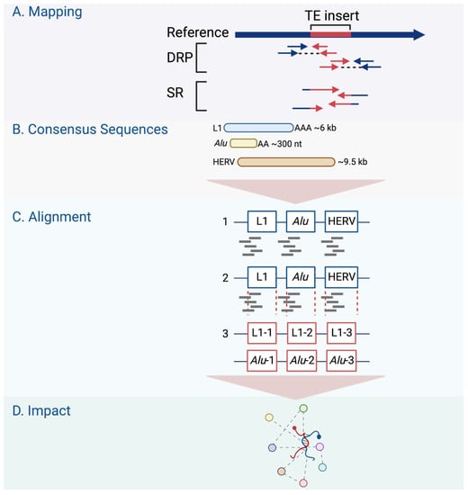 Genome-wide retrotransposon studies workflow. (A) TE novel insertions are detected in the human genome using sequencing reads using different mapping strategies, including DRP and SR. (B–D) The consensus sequences of active TE classes are obtained from repository databases and aligned to identify their differential expression in the genome.