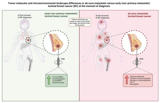 Differences in the Tumor Molecular and Microenvironmental Landscape between Early (Non-Metastatic) and De Novo Metastatic Primary Luminal Breast Tumors